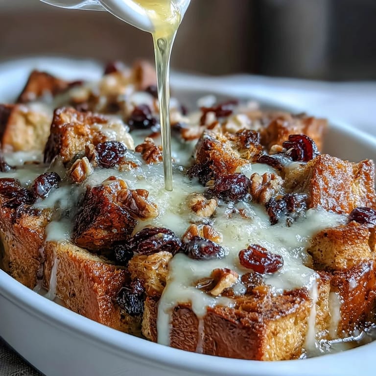 - Start with half the toasted bread at the bottom of your dish, sprinkle with raisins, cheese, and nuts, then drizzle generously with syrup. Repeat for a hearty second layer, pressing gently with a spatula so the bread soaks up every drop.