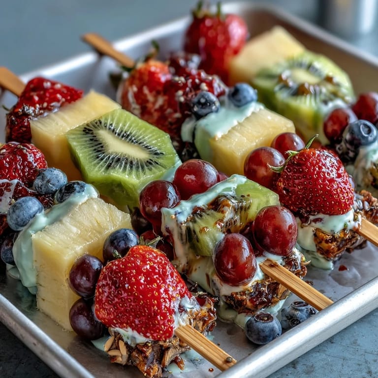 Save My daughter came home from school one day complaining that her lunchbox was boring, so I decided to turn the next day's lunch into something that felt like a special treat rather than an obligation. I remembered how much more fun food becomes when it looks playful and colorful, and suddenly the idea of fruit on sticks with a creamy dip seemed genius—simple enough that she could help assemble it, but fancy enough to make her feel celebrated during lunch period.